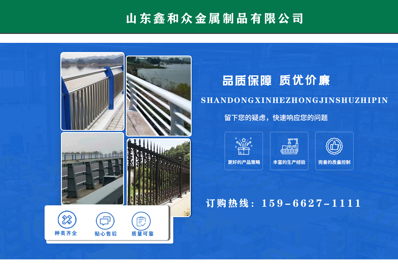 山東鑫和眾金屬制品有限公司主要產(chǎn)品有防撞護(hù)欄,橋梁護(hù)欄,道路護(hù)欄,河道護(hù)欄,不銹鋼護(hù)欄等護(hù)欄。提供設(shè)計方案,一站式定制,包您滿意價格優(yōu)惠,歡迎來電咨詢! 公司常年從事銷售護(hù)欄防撞護(hù)欄,橋梁護(hù)欄,道路護(hù)欄,河道護(hù)欄,不銹鋼護(hù)欄,橋梁鋼護(hù)欄,河道燈光護(hù)欄等。產(chǎn)品廣泛應(yīng)用于橋梁、河道、旅游景區(qū)、道路、公路、公園、小區(qū)、景觀、道路防撞等領(lǐng)域。 公司產(chǎn)品均采用優(yōu)質(zhì)不銹鋼材料,符合相關(guān)標(biāo)準(zhǔn)。各種型號不銹鋼復(fù)合管及護(hù)欄,質(zhì)量嚴(yán)格把控。產(chǎn)品強(qiáng)度高、耐腐蝕、焊接牢固、抗沖擊、性能好,防撞護(hù)欄結(jié)構(gòu)簡單、美觀實(shí)用大方?! g迎前來訂購!...